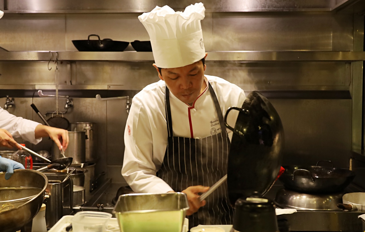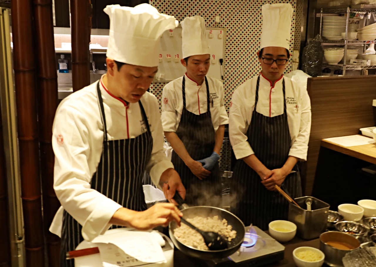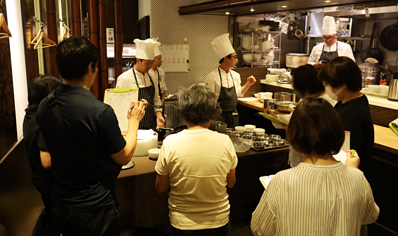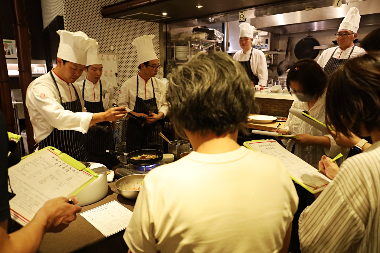 参加者はメモ帳を片手に「油はしっかり熱してから」「香味野菜を入れた瞬間が勝負」といった解説を一字一句逃すまいと耳を傾けます。
