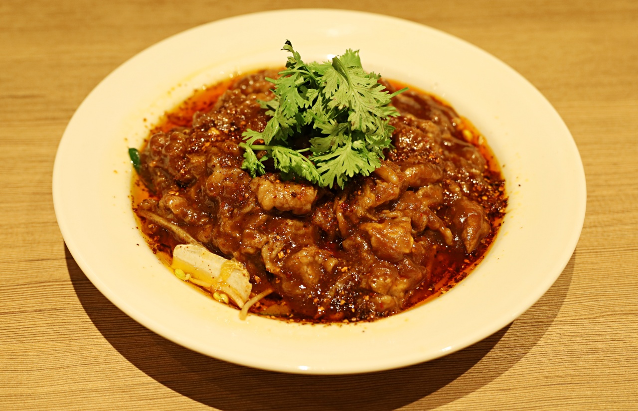 続いては「牛肉の辛子煮込み」。豆板醤と唐辛子の香りが立ちのぼり、一気に四川らしい辛さと香りが広がります。