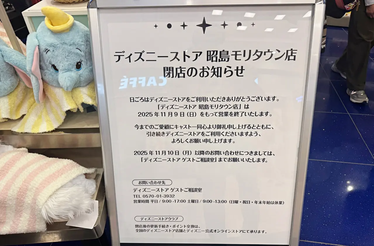 「ディズニーストア 昭島モリタウン店」は2025年11月9日(日)をもって営業を終了するそうです。