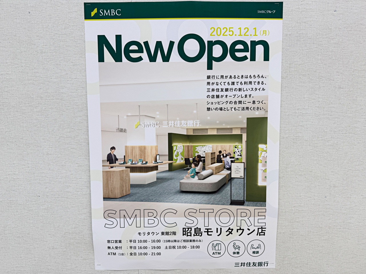 情報提供をもとに現地を訪れると、「昭島モリタウン1階ATM出張所」オープンのお知らせが掲示されていました。