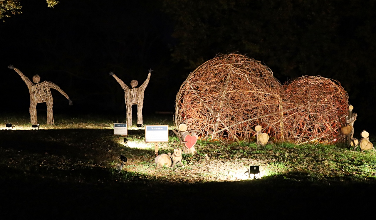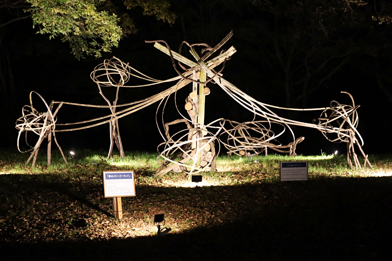 公園内で剪定された樹木や間引いた竹、倒木などを土に還す前にもう一度作品としてよみがえらせるという取り組みです。ライトアップによって夜ならではの表情を楽しむことができました。