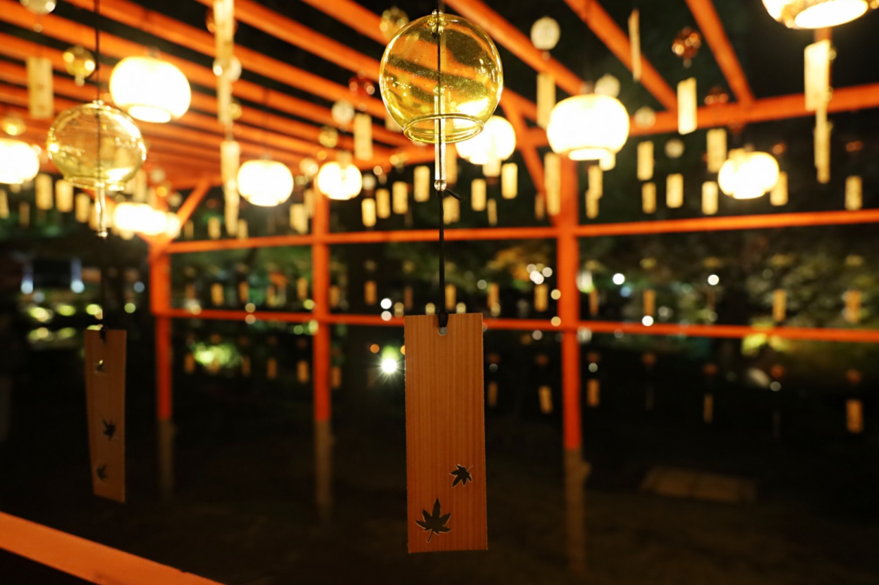 紅葉のほかにも、和傘や風鈴が並ぶ演出スポットがあり、こちらも幻想的で思わず写真や動画を撮りたくなる美しさです。