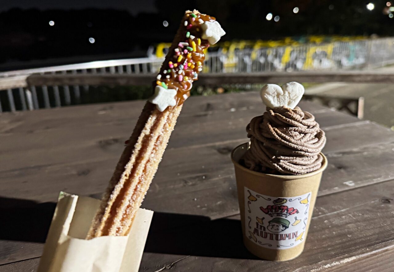 水鳥の池周辺にあるレイクサイドレストランでは、温かい飲み物や軽食のほか、秋の夜散歩おすすめメニューのモンブランとチュロスを販売していました。