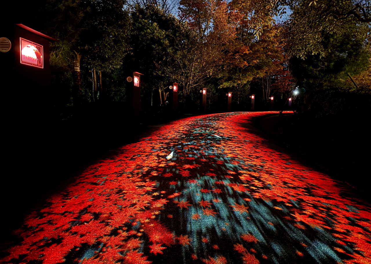 カシオ計算機による、鯉や紅葉が小道に映し出されるプロジェクションマッピング「もみじの色彩譚」。足元の小道がまるで物語の世界に迷い込んだかのように彩られ、その美しさに思わず立ち止まってしまいます。