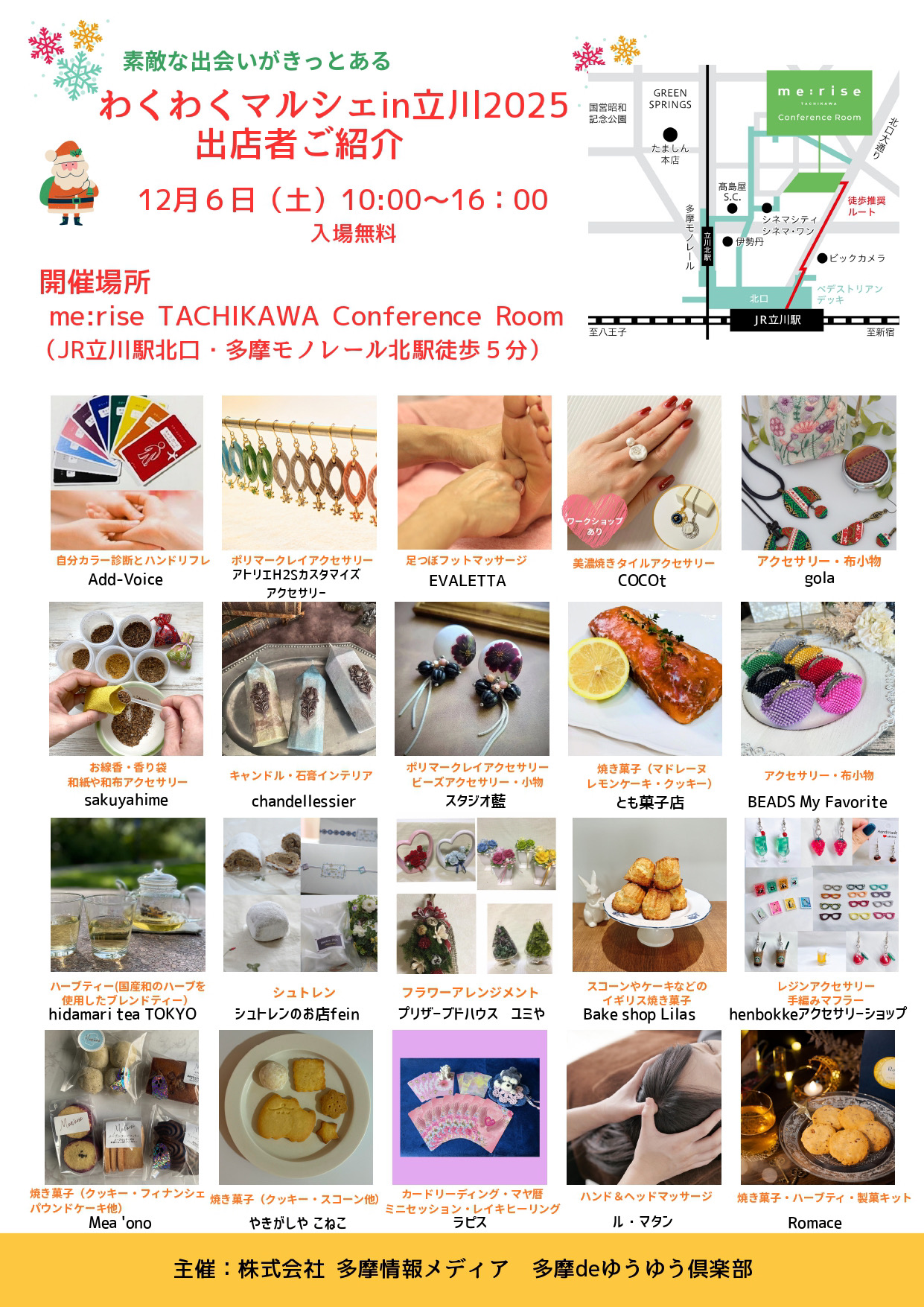 2025年12月6日(土)、立川駅北口エリアにある me:rise TACHIKAWA(ミライズ立川)Conference Room にて、「わくわくマルシェ in 立川2025」が開催されます!