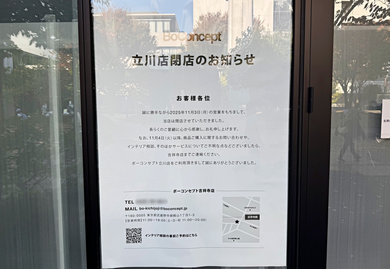 【立川市】GREEN SPRINGS1階「BoConcept(ボーコンセプト)」開業時からの店舗が閉店へ【11/3】