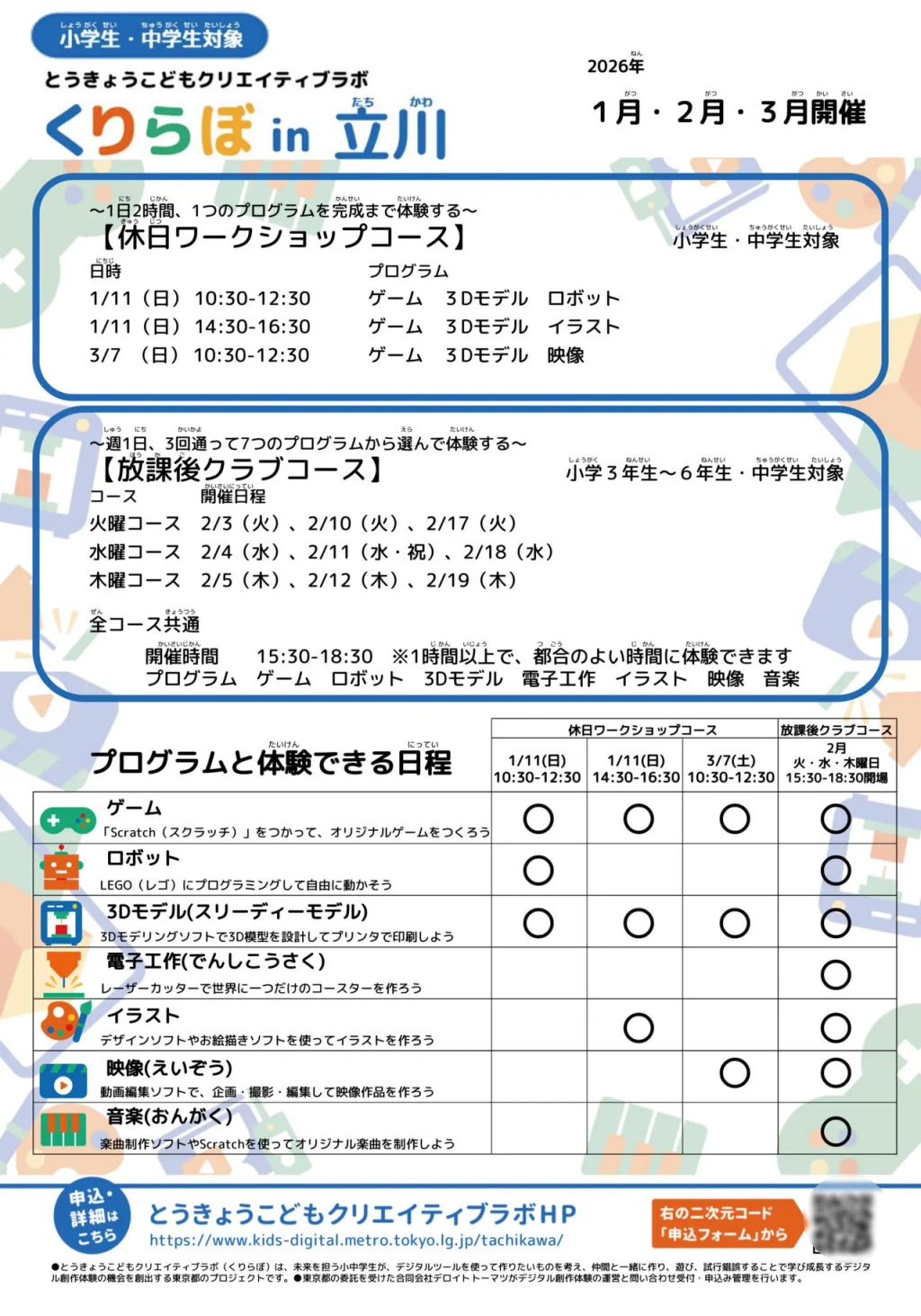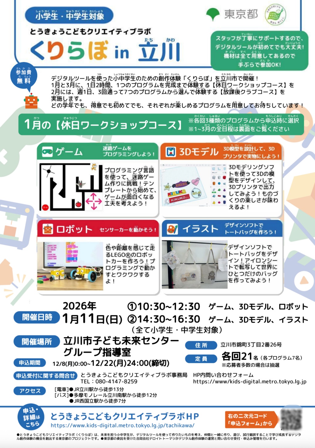 都内の小・中学生を対象としたデジタル体験ワークショップ「くりらぼin立川」が、2026年1月11日(日)に開催されるそうです!