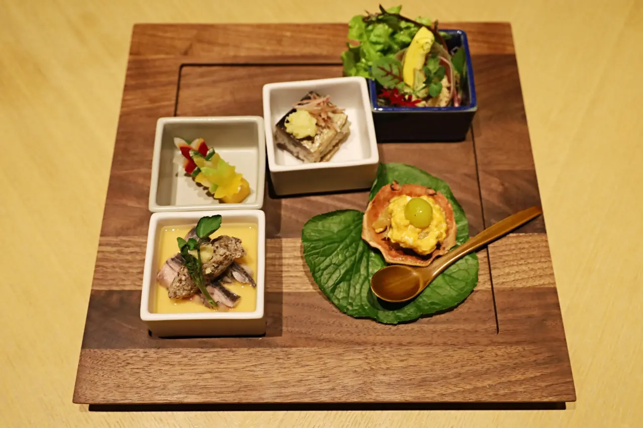 上海蟹/大根餅/柿なます/秋刀魚の棒寿司/東京うこっけい冷製茶碗蒸し/DAICHIの恵みサラダ