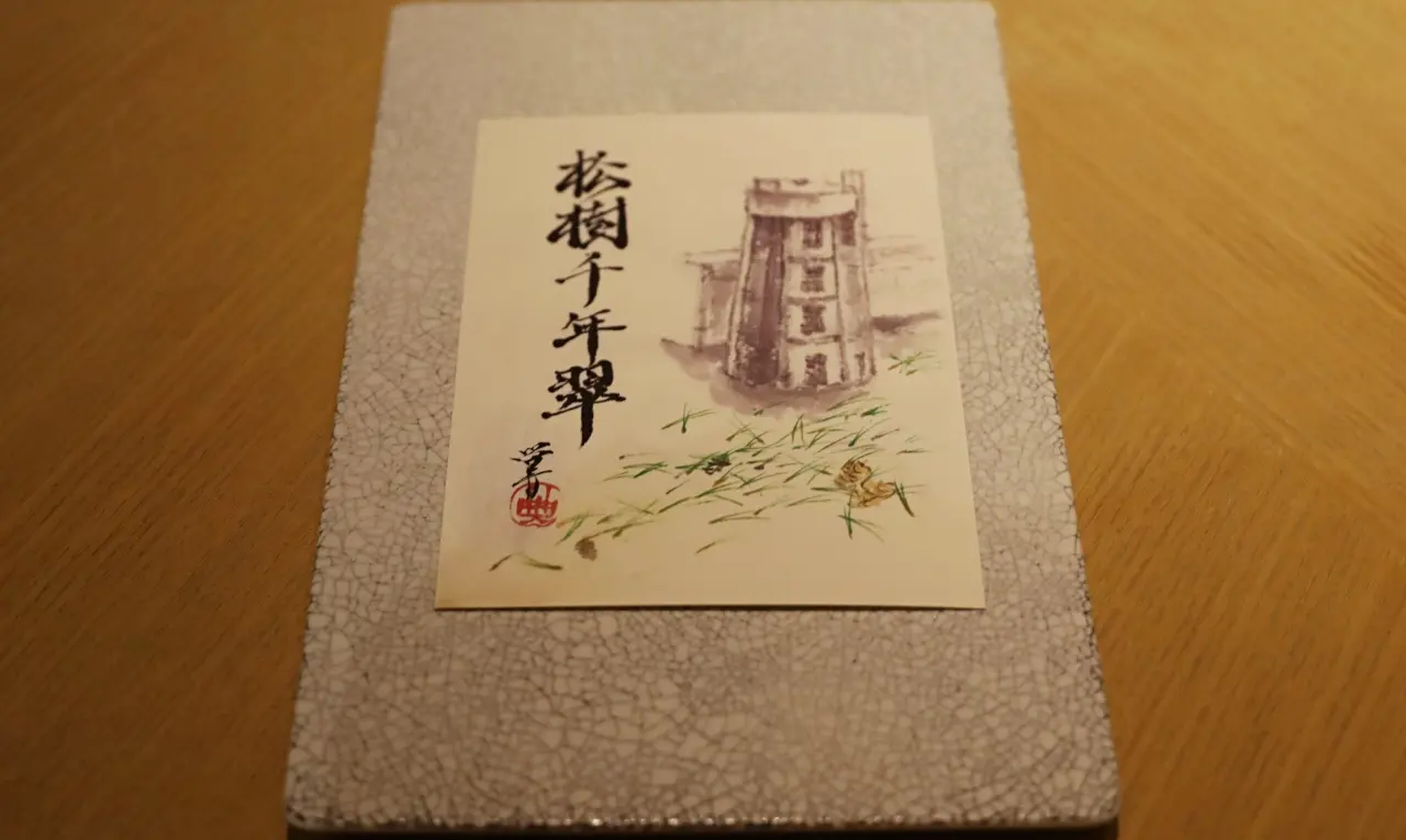 お造りをいただくと、そこにはオーベルジュ ときと 総合プロデューサー・総料理長 石井義典シェフが描いた立飛給水塔の絵葉書が。