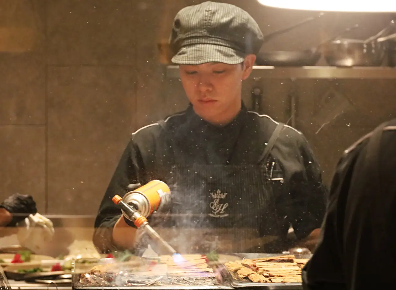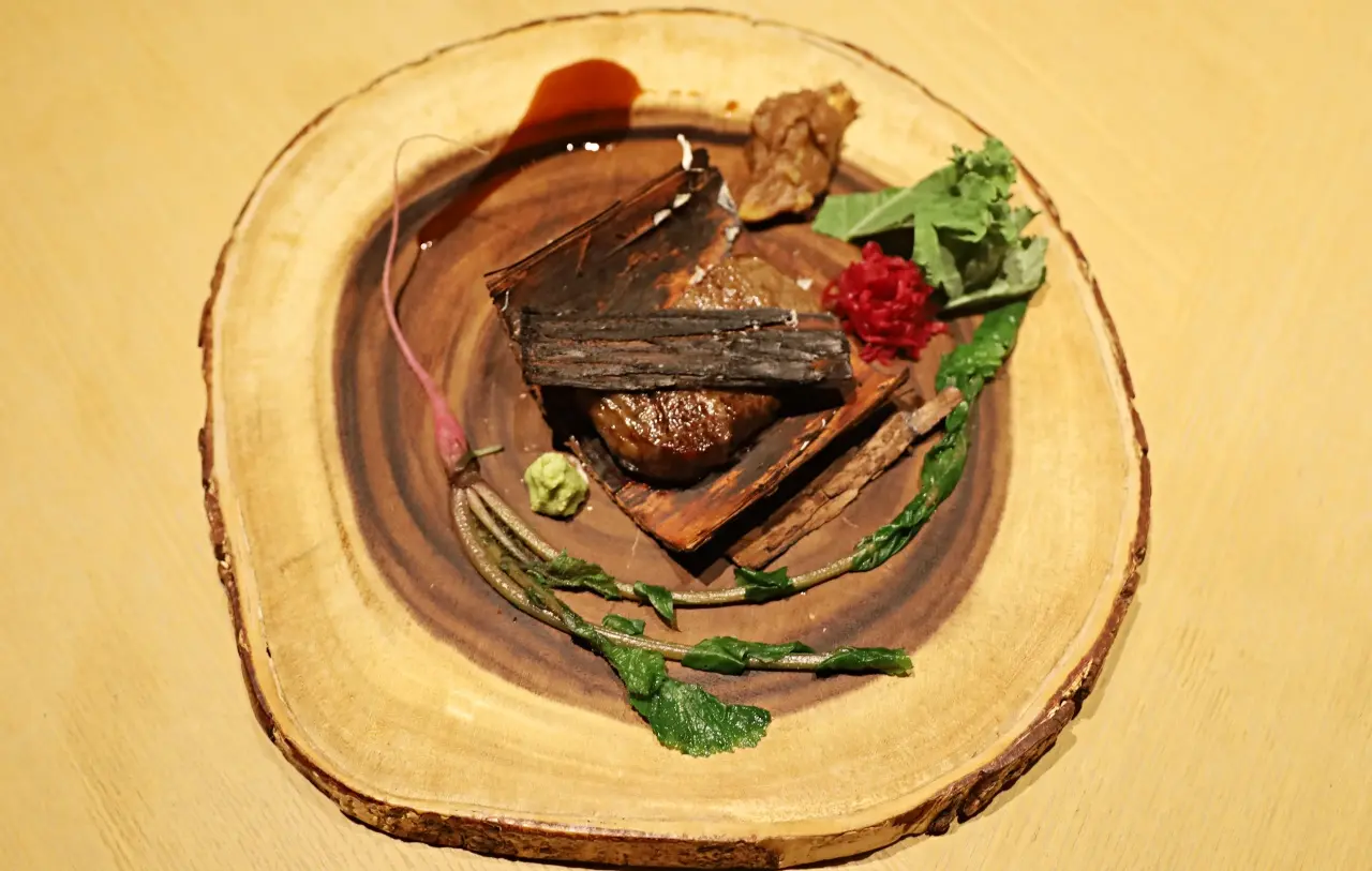 炭の香ばしい香りが立ちのぼるなか、メインの 肉料理「秋川牛フィレ肉 多摩産杉皮焼き」 が仕上げられていきます。