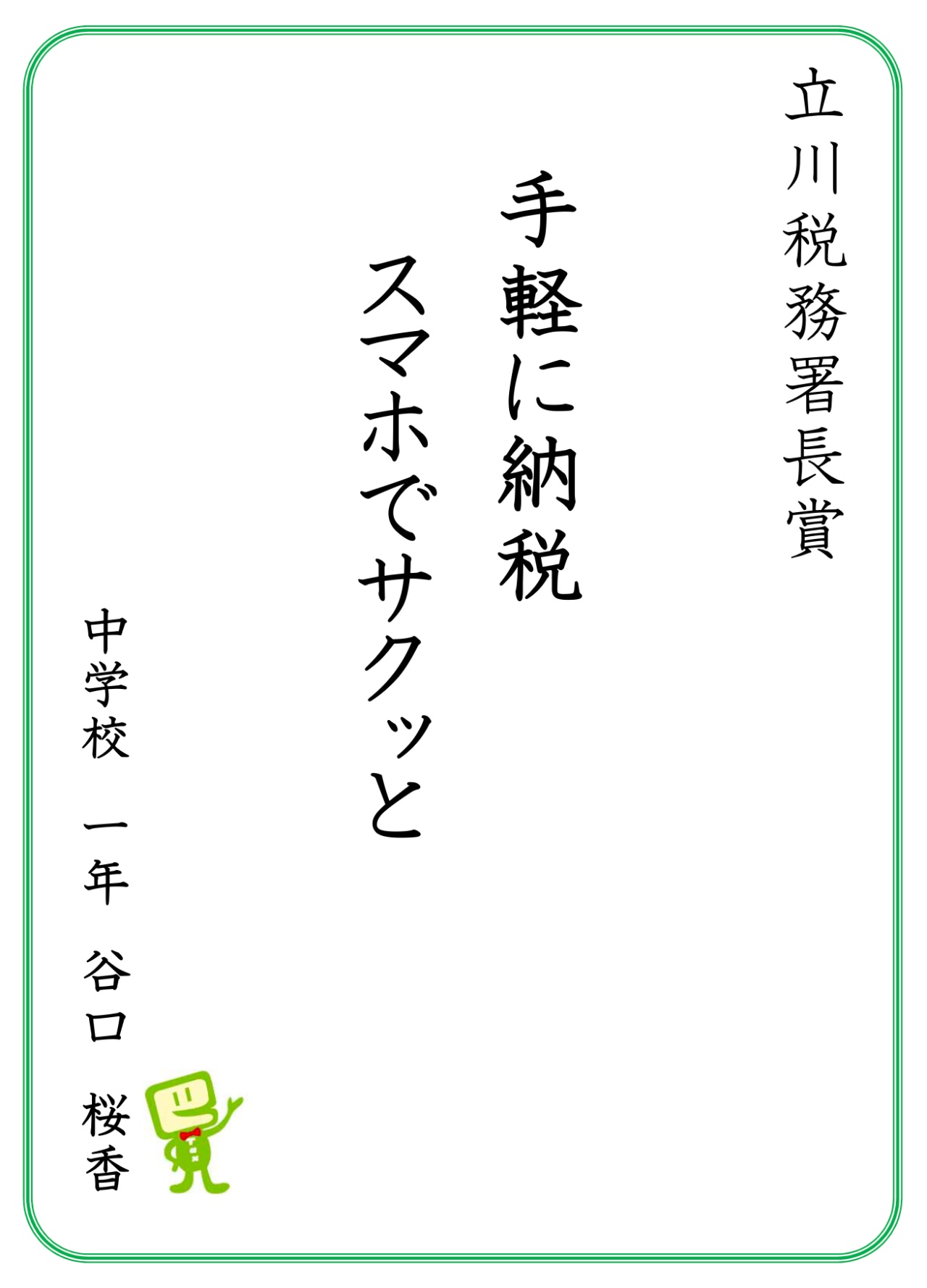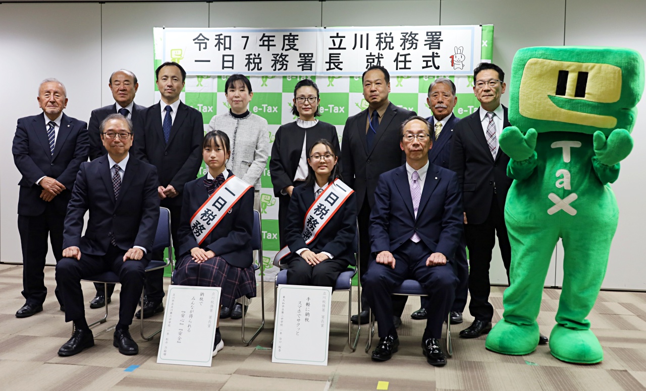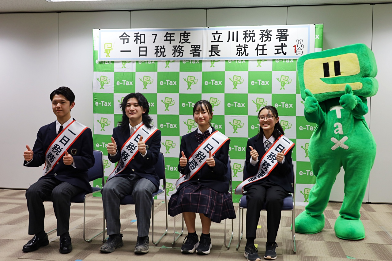 2025年12月12日(金)、立川税務署にて、中学生の「税についての作文」「税の標語」、小学生の「税の絵はがき」において税務署長賞を受賞した5名が、「一日税務署長」に就任しました。