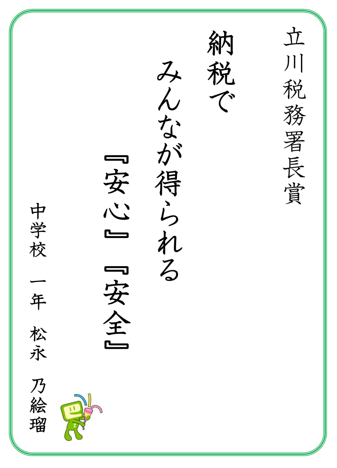 将来が楽しみな小・中学生のみなさんが、身近に感じた税について自ら調べ、理解したことを作品として表現しました。税に関心を持ち、正しく理解していくきっかけとなる、非常に意義のある取り組みですね。筆者自身も多くの学びをいただきました。税務署長賞を受賞された皆さん、本当におめでとうございます!