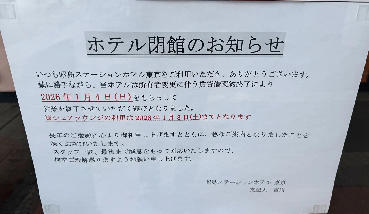 【昭島市】昭島駅前の「昭島ステーションホテル」が35年の歴史に幕。2026年1月4日で営業終了。