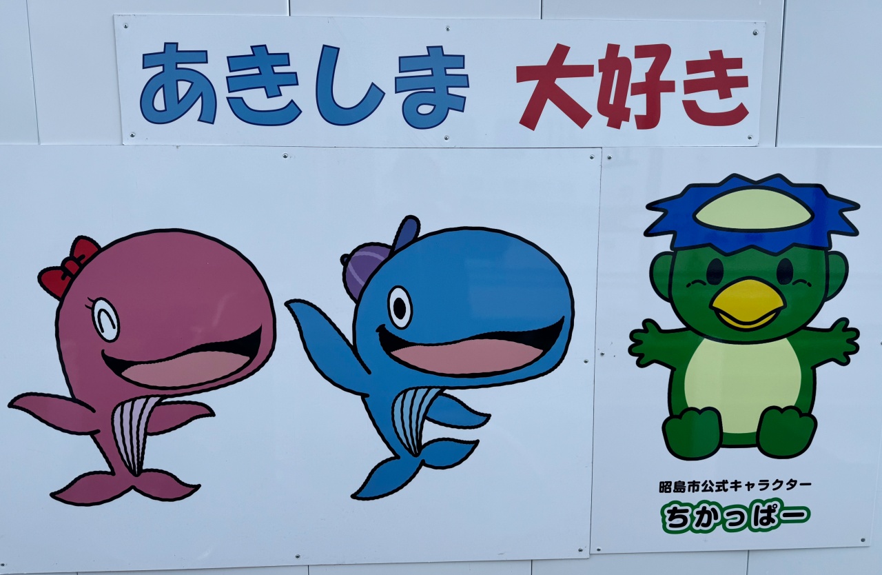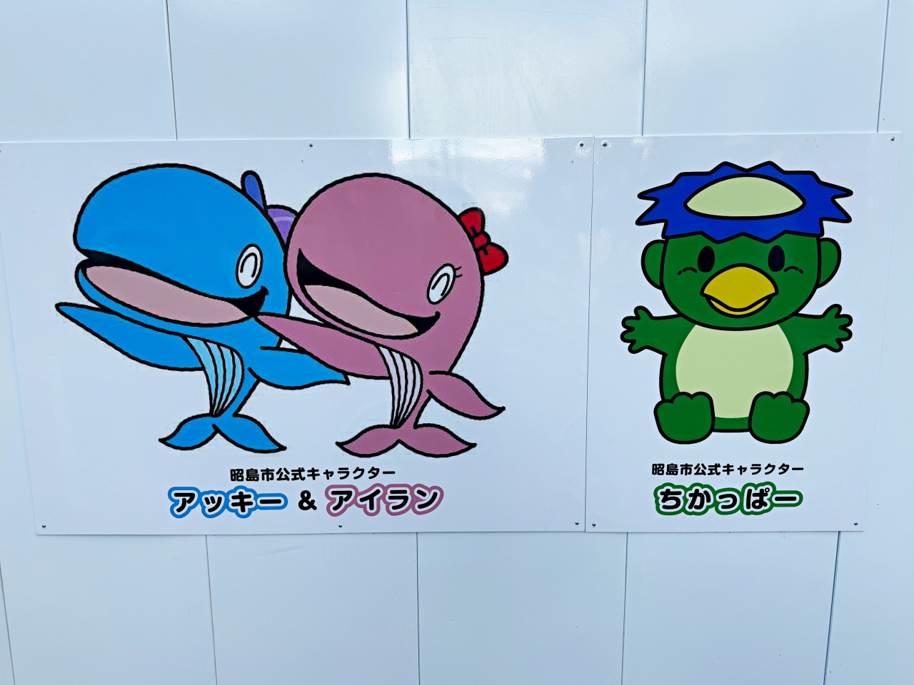 工事柵には、昭島市公式キャラクターのちかっぱー、アッキー&アイランの姿もあり、