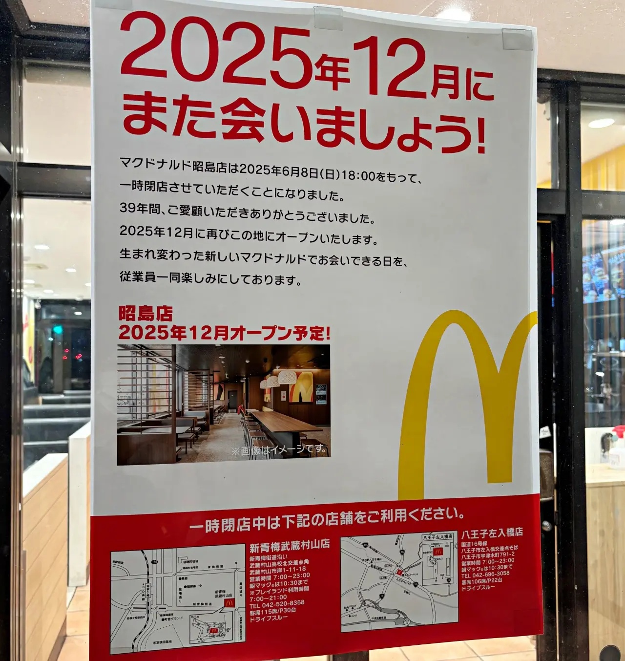 【昭島市】昭和の面影、39年の歴史に幕。マクドナルド昭島店が6月8日(日)に一時閉店