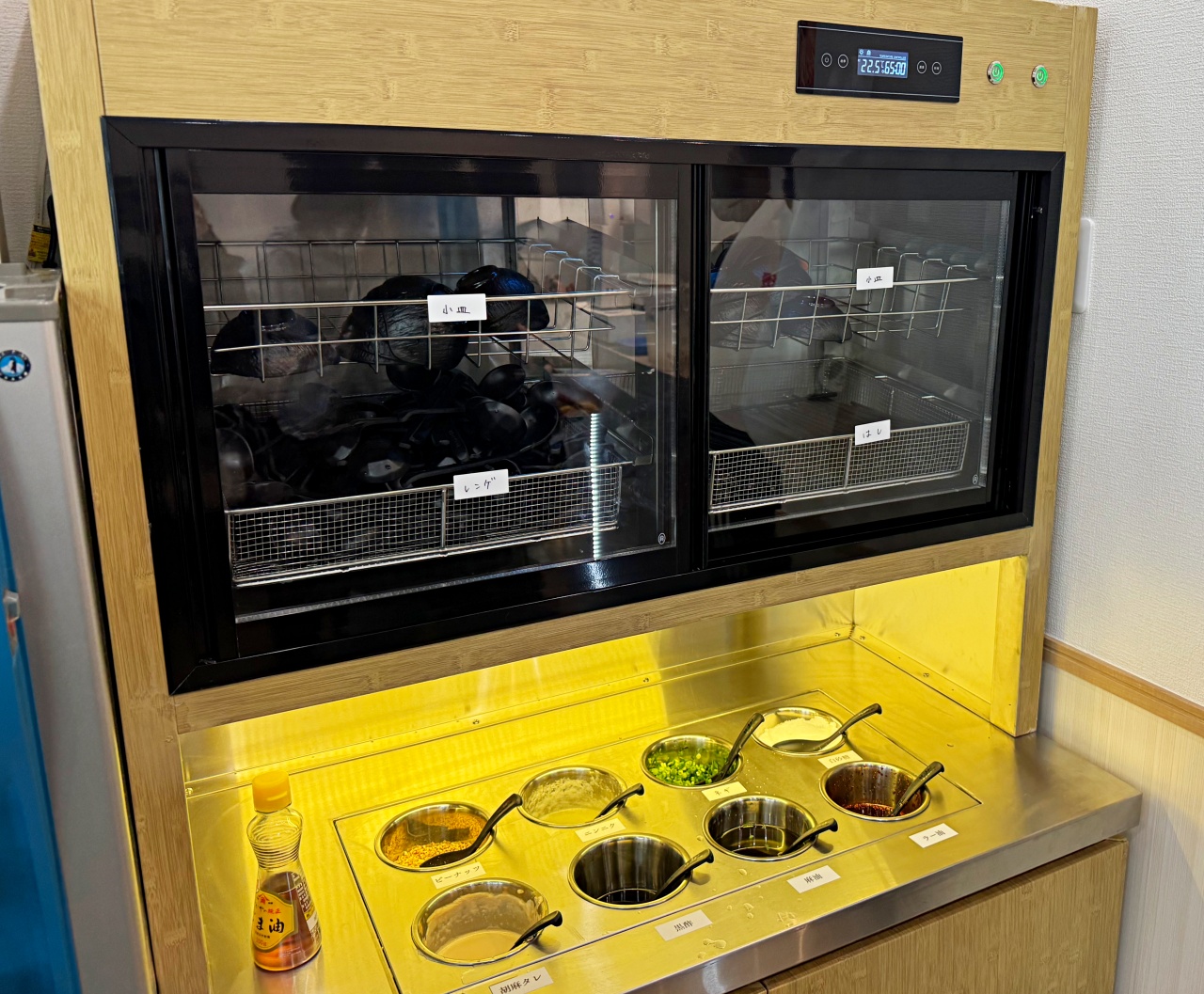 辛さはレジで0辛〜5辛から選択可能。ピーナツ、砂糖、ニンニク、胡麻タレ、ネギ、ラー油などの味変調味料は自由に使え、少しずつ加えながら自分好みの味に仕上げられます。