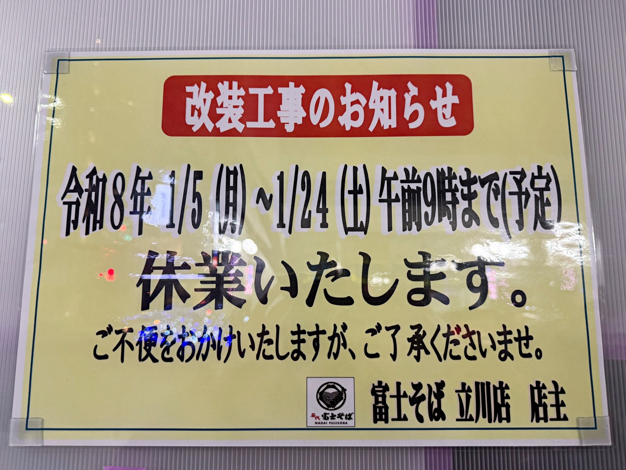 名代 富士そば 立川店(2026年1月5日(月)〜1月24日(土)午前9時まで(予定)休業)はこちらです↓