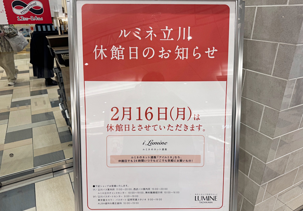 2026年2月16日(月)は、ルミネ立川休館日(一部店舗を除く)です。