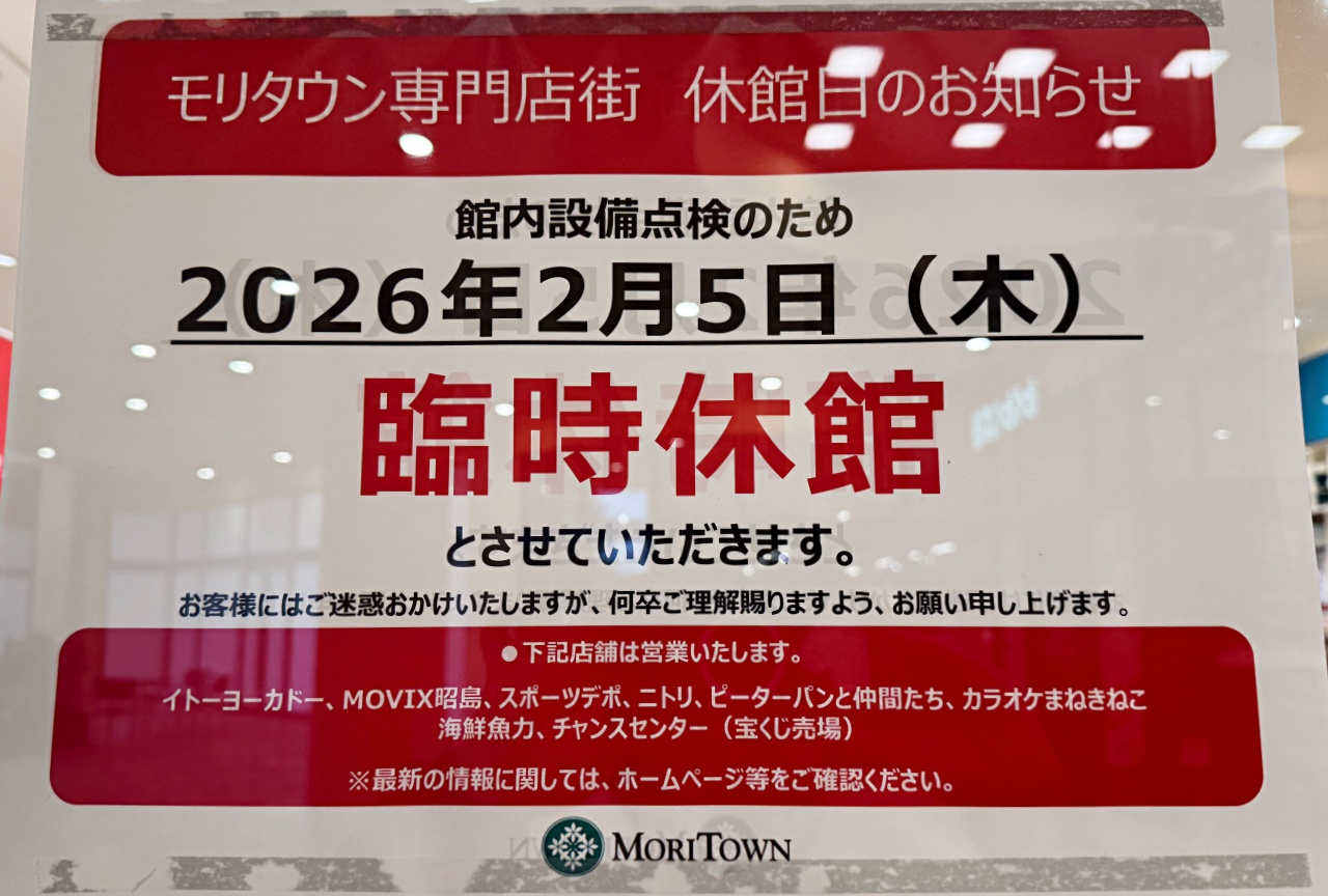【昭島市】行く前に要確認! 2月5日モリタウン臨時休館・2月17日イトーヨーカドー昭島店は開店時間変更。