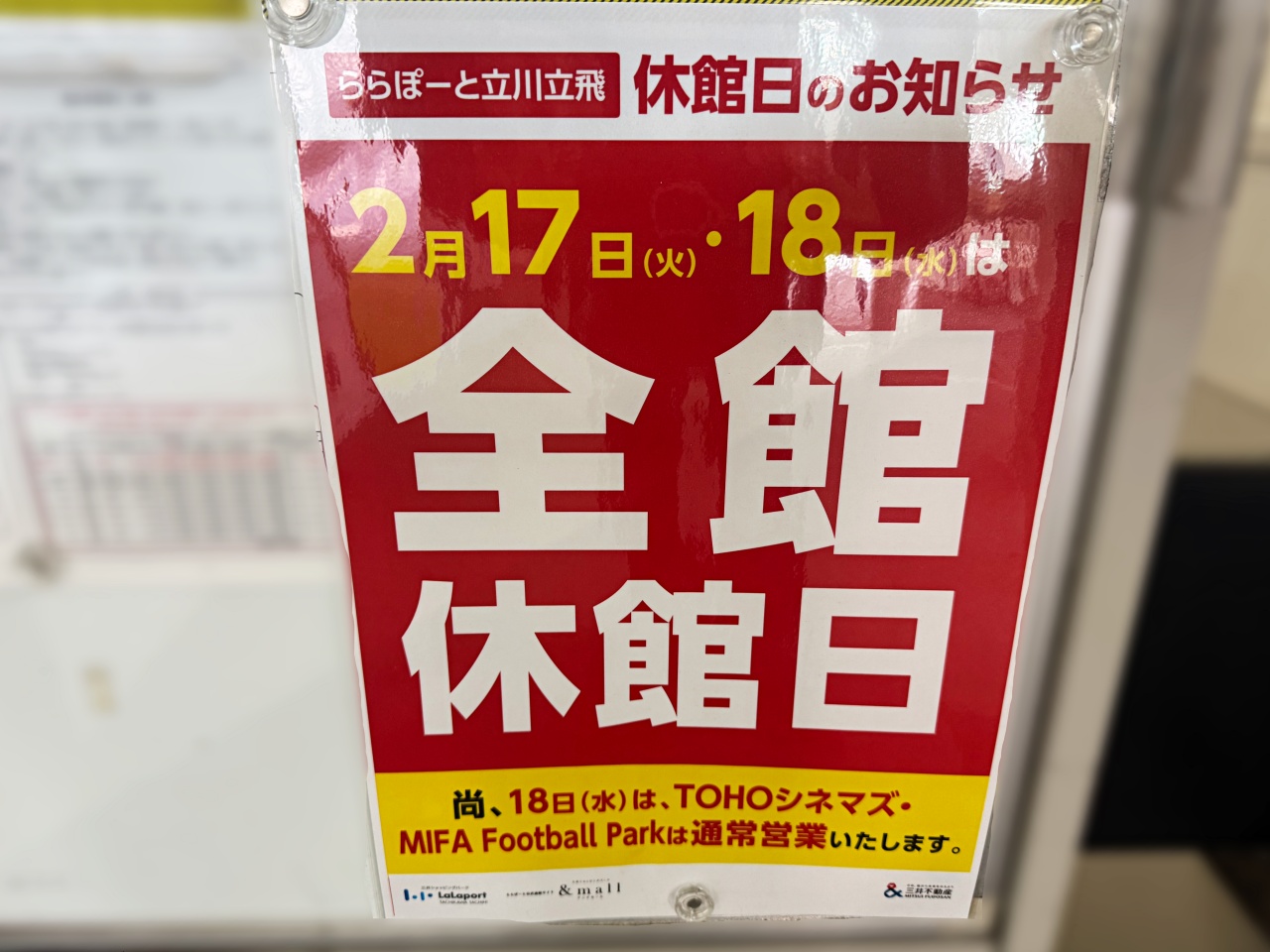 【立川市】ららぽーと立川立飛が2日間休館へ。2月17日は全館休業、18日は一部のみ営業。