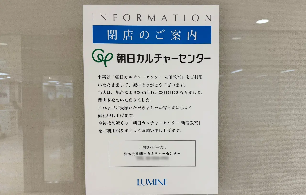 【立川市】ルミネ立川9階の「朝日カルチャーセンター立川教室」が2025年12月28日をもって閉室していました。