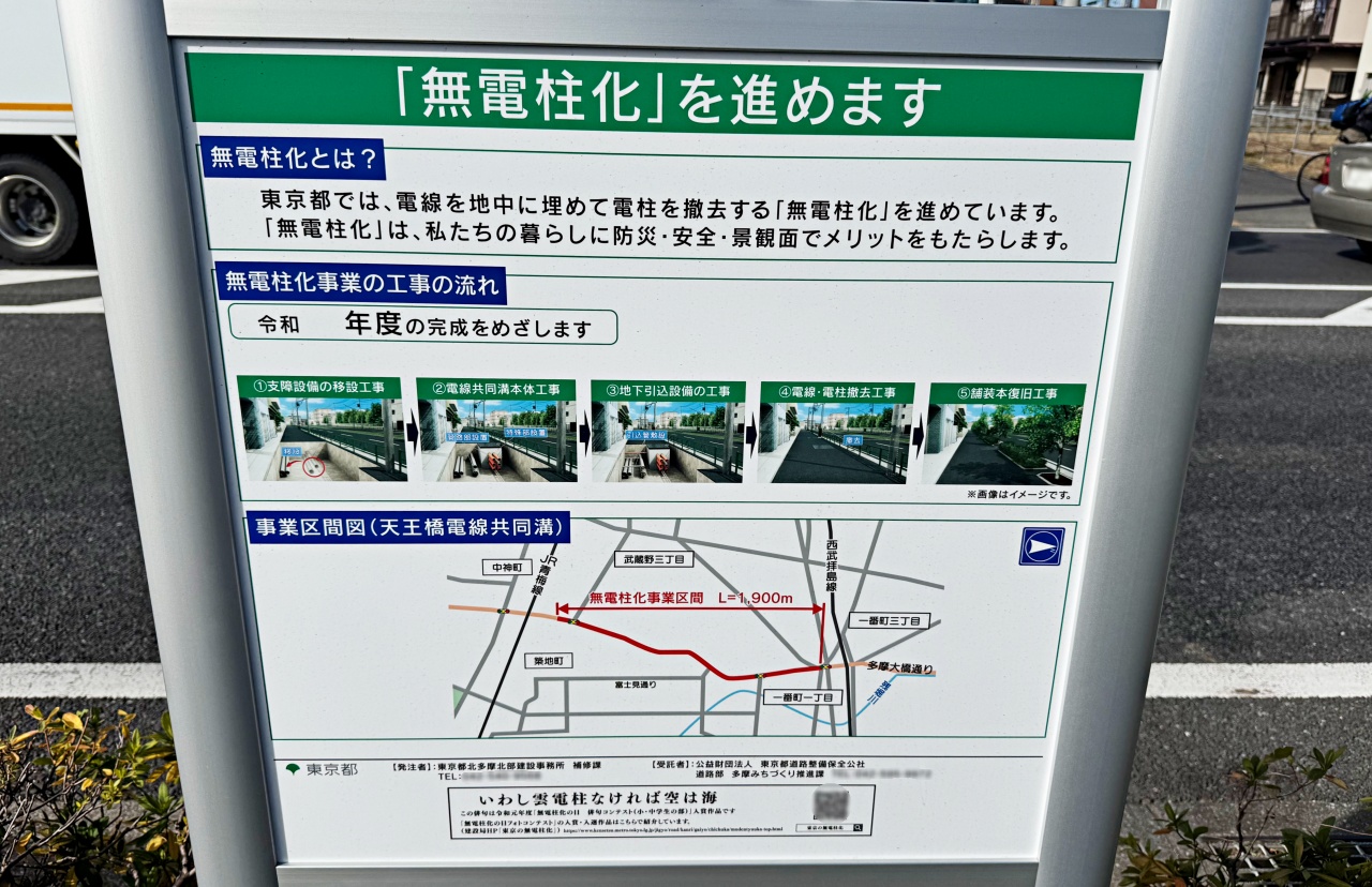 多摩大橋通りでは、すでに一部区間で無電柱化が行われている場所もありますが、今回新たに確認された看板によると、事業区間は昭島市の中神立体(富士見公園)付近から立川市の天王橋手前付近までの約1.9kmとされています。