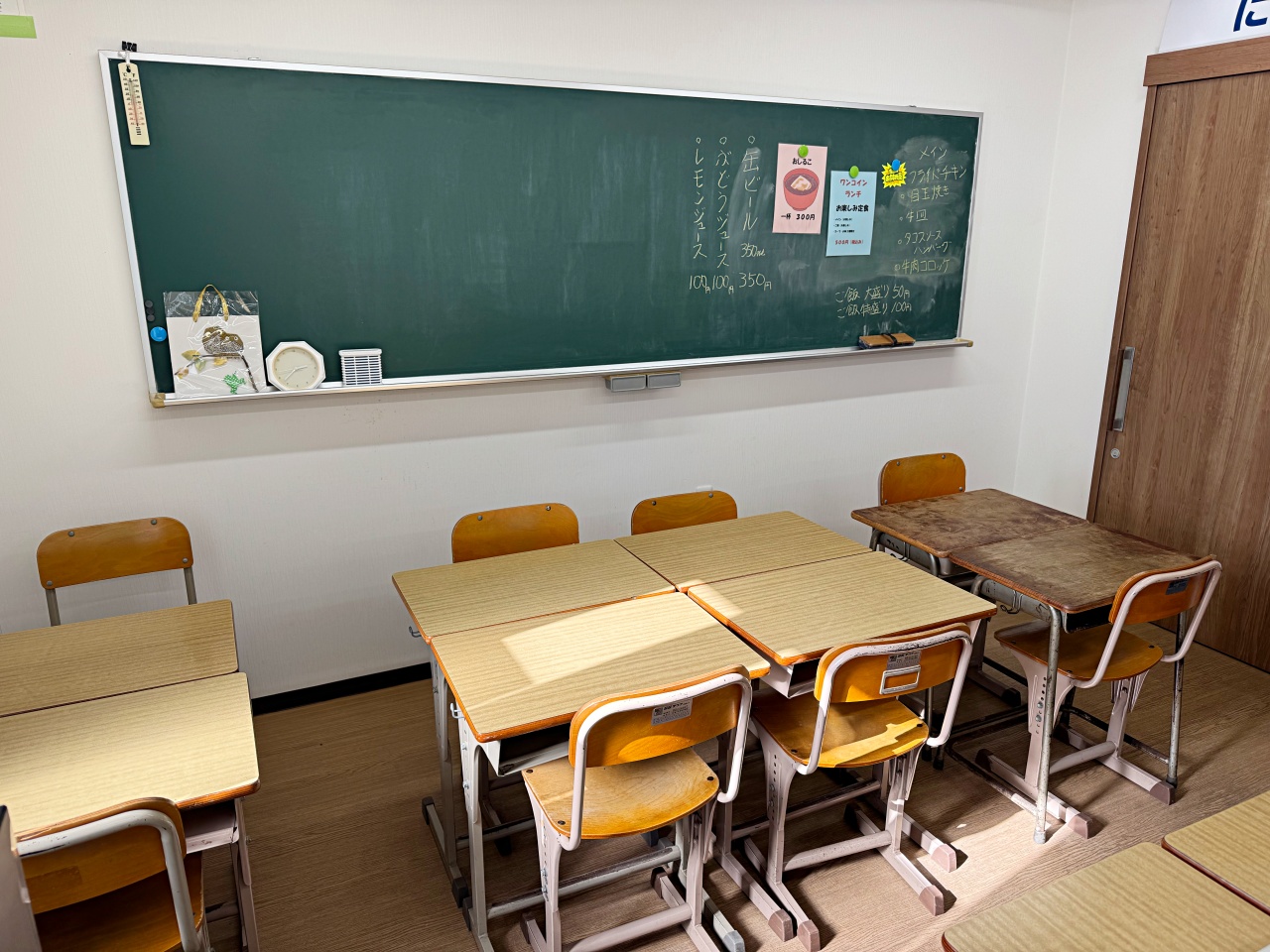 店内には、小学校でおなじみの学校机が並び、席数は12席。黒板に書かれたメニューを眺めていると、どこか懐かしく、学校に戻ったような気分になります。