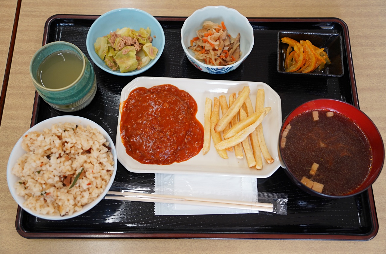 この日のご飯は山菜ご飯。普通盛りでもしっかりとしたボリュームがあります。