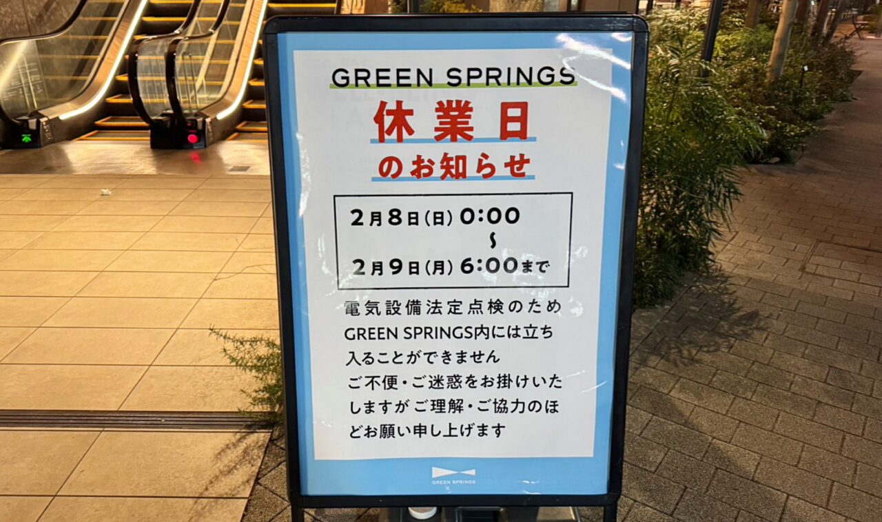 GREEN SPRINGS(グリーンスプリングス)は、2026年2月8日(日)の終日と、2月9日(月)朝6時まで、街区休業となります。