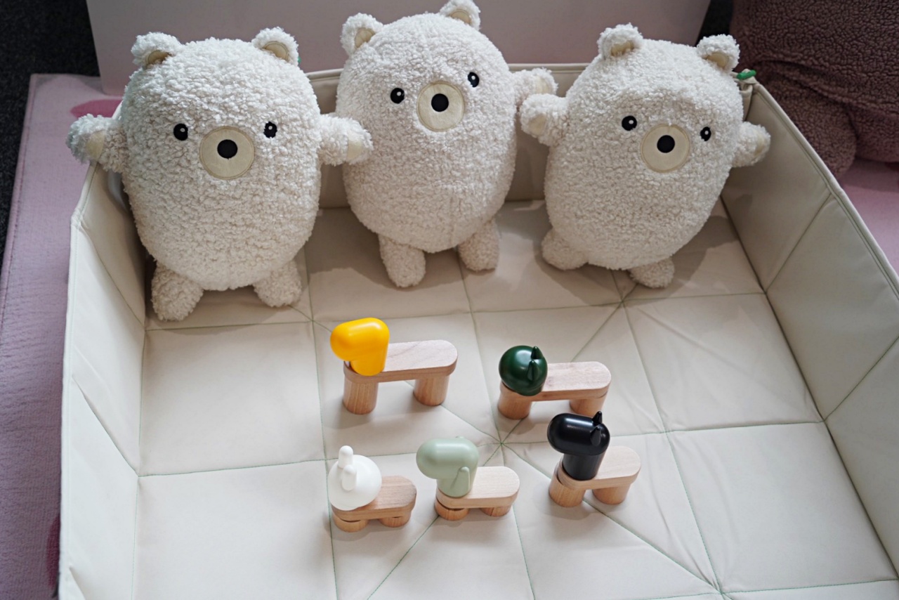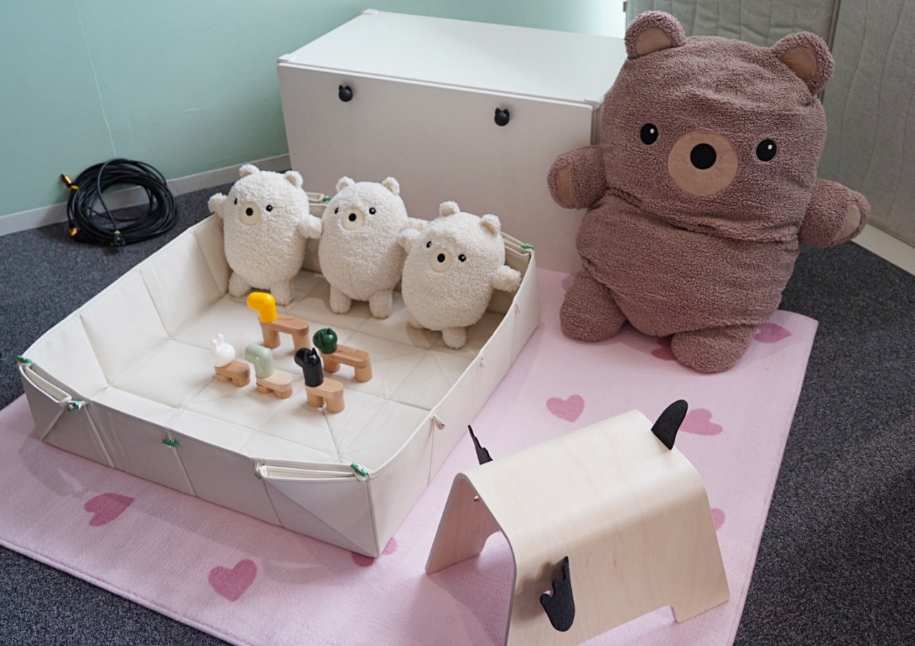 写真白いクマと茶色いクマ:ぬいぐるみ 写真手前:子ども用スツール