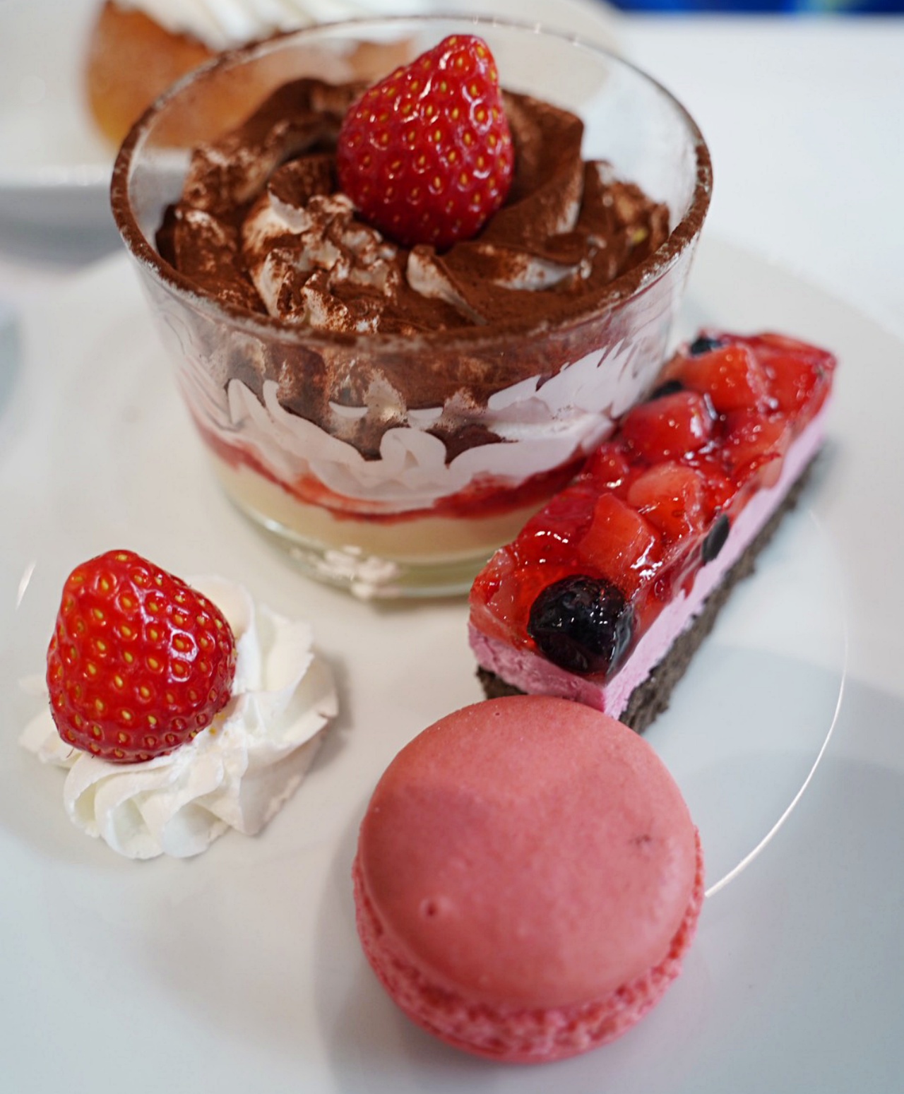いちごのティラミスを中心に、ケーキやマカロンなど、いちごをたっぷり使ったデザートが一皿に盛り合わせられた、見た目にも華やかなアソートです。
