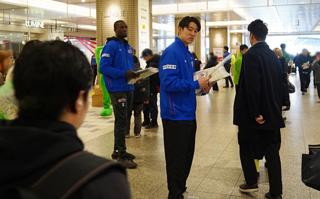 会場には、立川ダイスからカボンゴ・ジョナサン選手と大内淳輝選手が参加。通行中の方々に向けて声をかける姿に、足を止めて話を聞く人の姿も多く見られました。