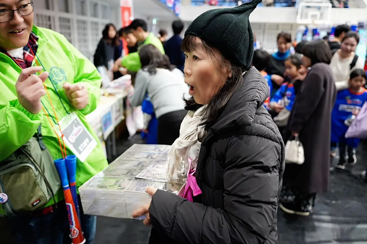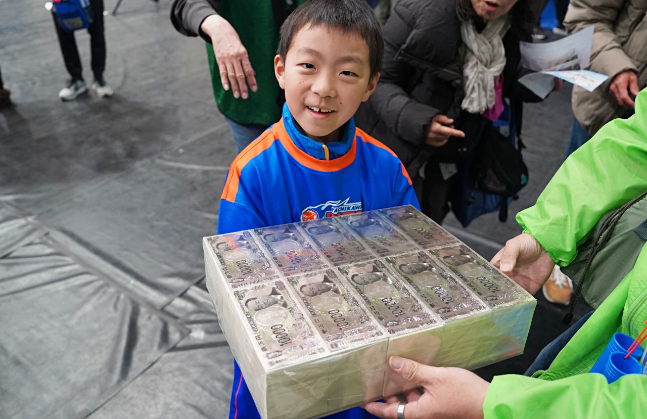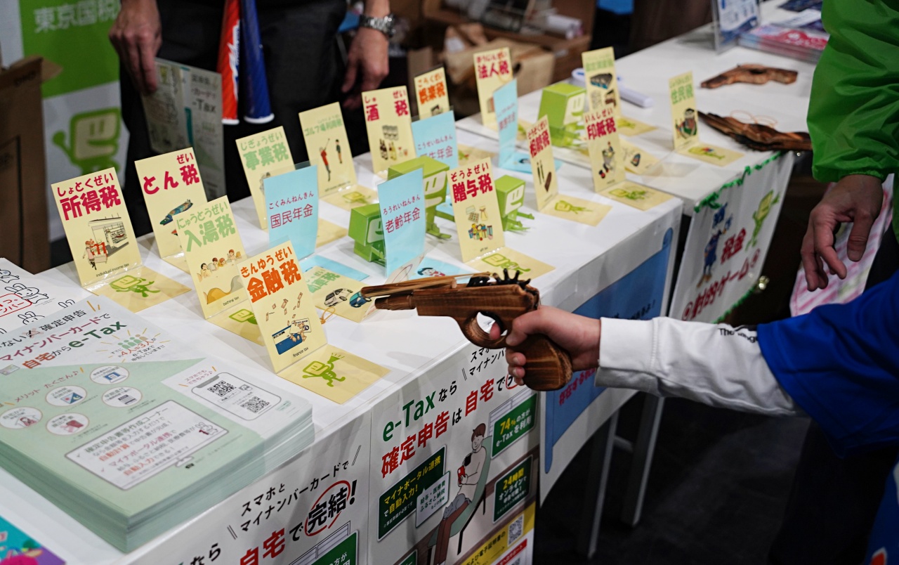 ブースでは恒例の「税金射的ゲーム」や「1億円の重さ体験」が登場。