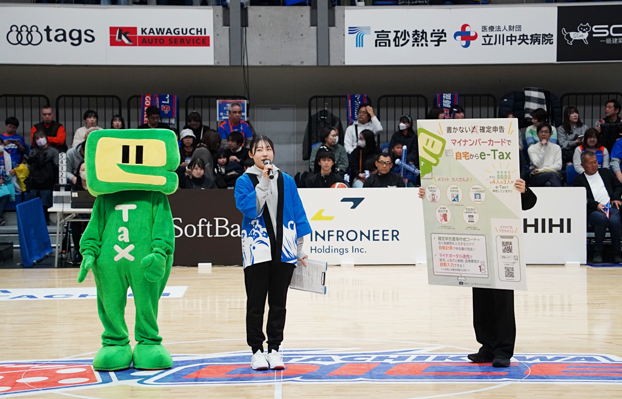 試合は「立川税務署プレゼンツ」として開催され、会場には立川税務署のPRブースが登場しました。