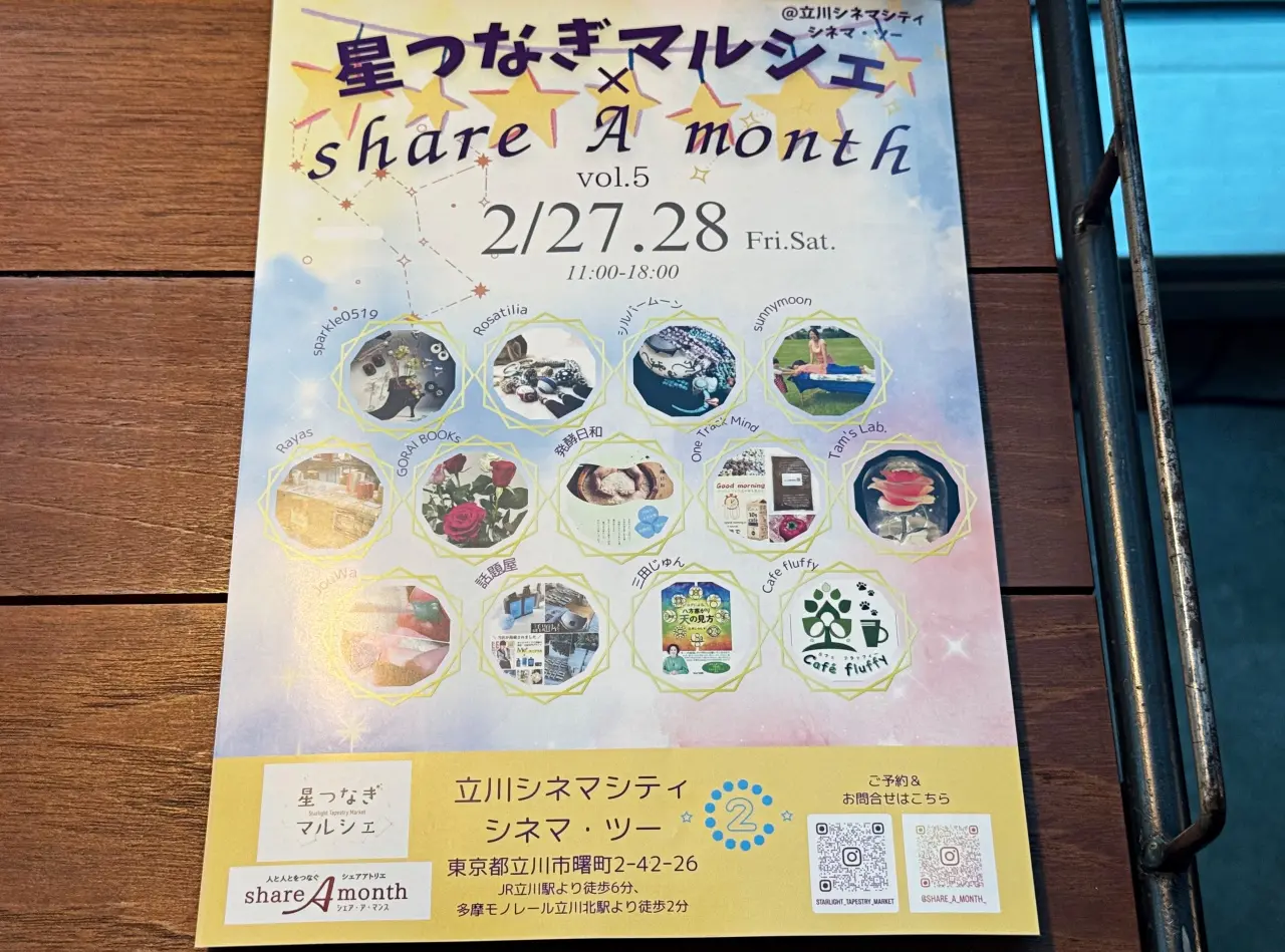 アクセサリーブランド「sparkle0519」と、立川のリラクゼーションサロン「sunnymoon」による共同企画イベント「星つなぎマルシェ × share A month vol.5」が、2026年2月27日(金)・28日(土)の2日間、シネマシティ シネマ・ツーで開催されます。