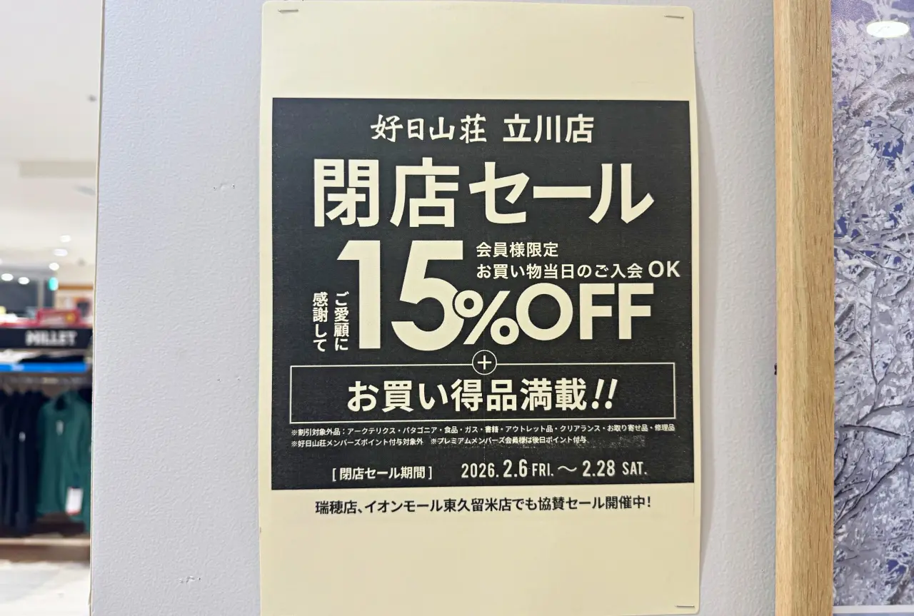 【立川市】フロム中武の『好日山荘 立川店』が4月5日に閉店。定価商品15%OFFの閉店セールを開催中です