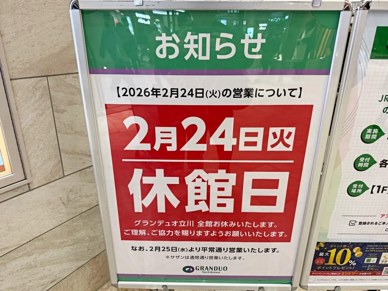 立川駅を利用する皆さんに、大切なお知らせです。 いつも賑わう「グランデュオ立川」が、2026年2月24日(火)に全館休館となります。
