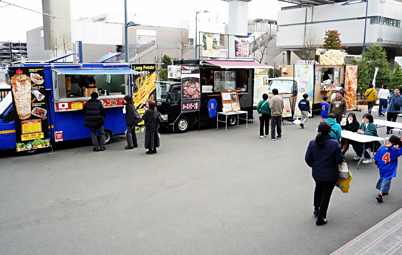 入場口付近にキッチンカーが並び、試合開始前やハーフタイム、試合終了後には特に多くの来場者で賑わいを見せていました。