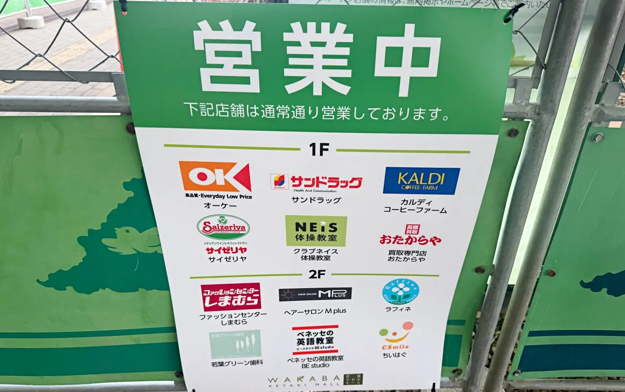2026年2月18日(水)現在の若葉ケヤキモール。 スーパーの「オーケー」や「サンドラッグ」などは変わらず営業していますが、モール内の1階エリアを歩いてみると、多くの区画が白いパーティションで覆われています。
