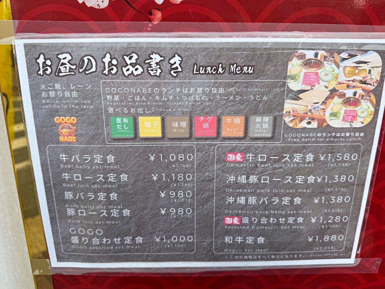 お昼の時間帯には、980円(税込1,078円)から楽しめる定食メニューもあります。 「豚バラ定食」や「牛バラ定食」などがあり、野菜・ごはん・キムチ・つけもの・ラーメン・うどんはレーンからお替り自由という太っ腹なシステムです! 筆者は、麻辣火鍋がとても気になります♪