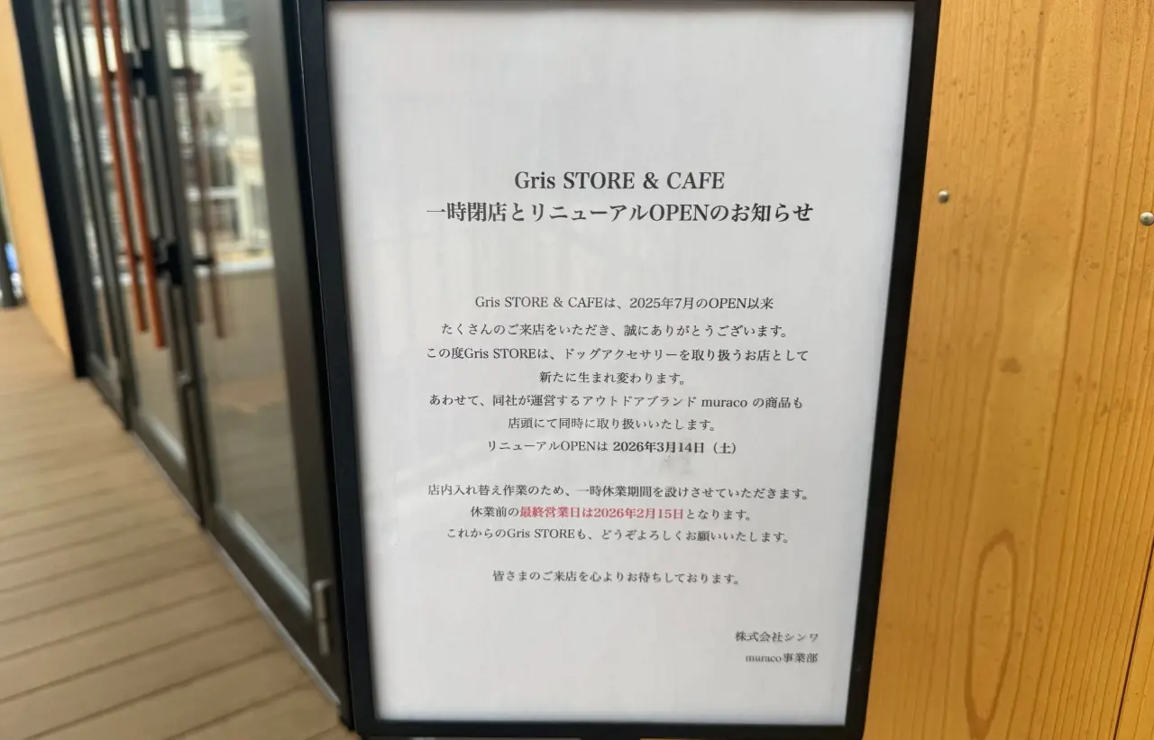 「COMMONS TACHIKAWA TACHIHI」内にある、愛犬家に愛されたGris STORE & CAFE。 残念ながらカフェ営業は終了し、2026年3月14日(土)にドッグアクセサリー専門店として生まれ変わるそうです。