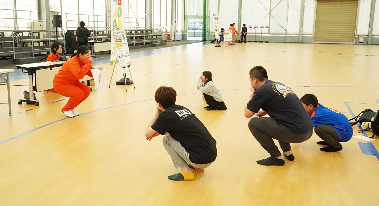 スクワットを行いながら、災害時を想定したポーズを取ることで、体力と防災意識の両方を高めるアクティビティです。