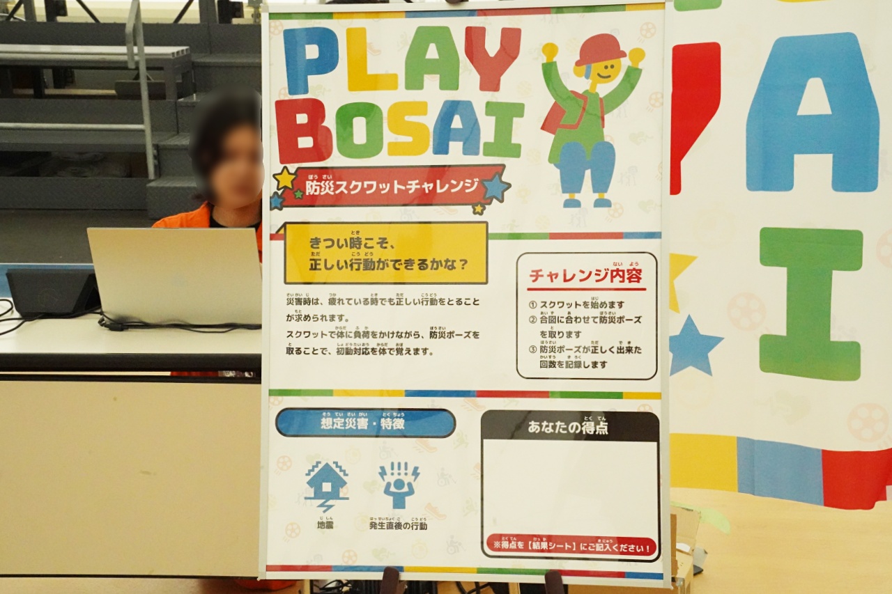 スクワットによる運動負荷の中で防災に関連した姿勢を繰り返すことで、災害時の行動をイメージしやすくし、防災をより身近なものとして捉えてもらうことを目的としています。