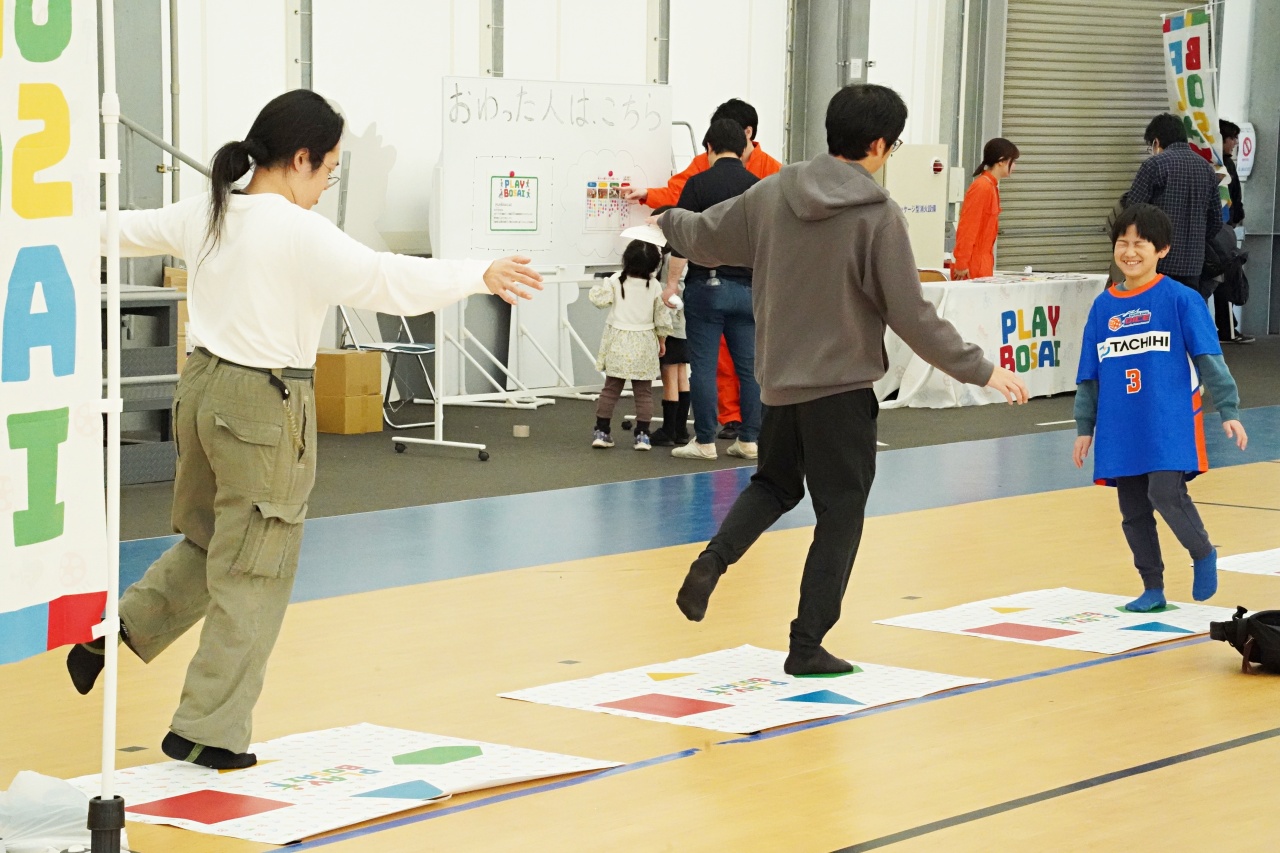 このプログラムでは、マットに描かれた大・中・小のマークから1つを選び、そのマークの上で片足立ちをすることで「バランスを保つ力」を体験します。