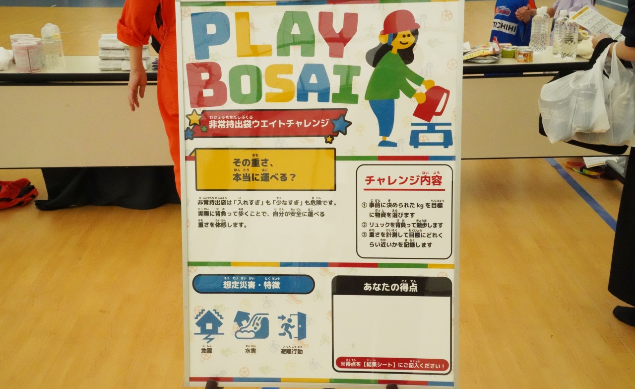 参加者は目標の重さを予想して物資を選び、完成した非常持出袋を背負って競歩でゴールを目指します。