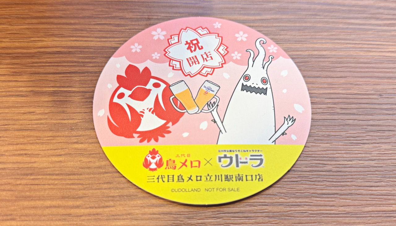 また、来店ノベルティとして、「メロちゃん」と「ウドラ」のイラストがデザインされたコースターが数量限定で配布されました。