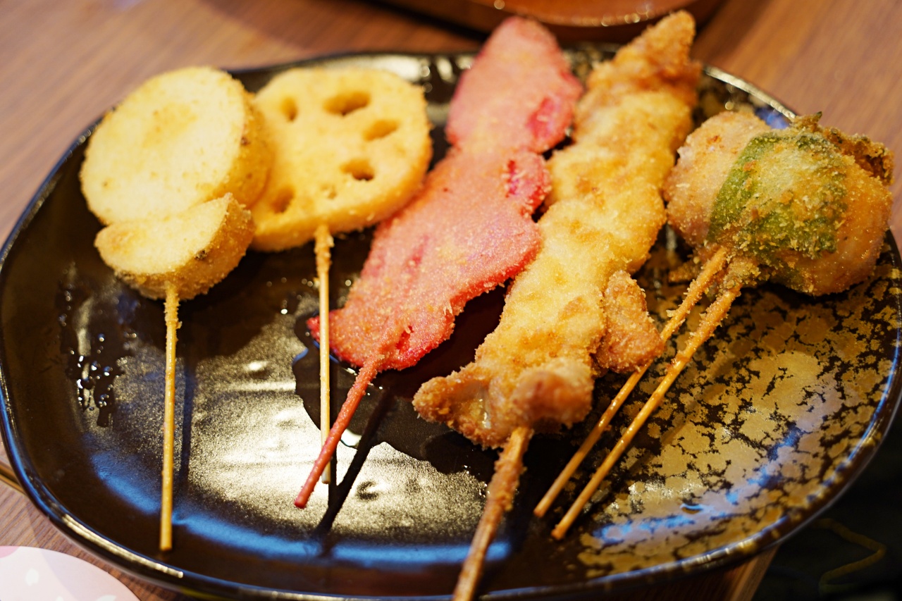 左から長芋、蓮根、紅生姜、鶏もも、豚肉梅しそです。おかませのため、何が提供されるかはその日のお楽しみとなります。もちろん、好きな串を1本ずつ注文することも可能です。