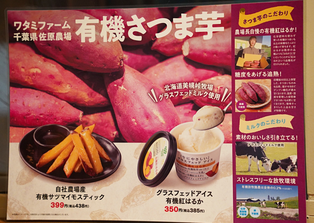 ワタミグループでは、自社で有機農場を持っているそうで、その中のワタミファーム千葉県佐原農場では、有機さつま芋を栽培されています。大手でもなかなかグループ農場で有機栽培をされている事例はなく、食材への本気度が伝わります。