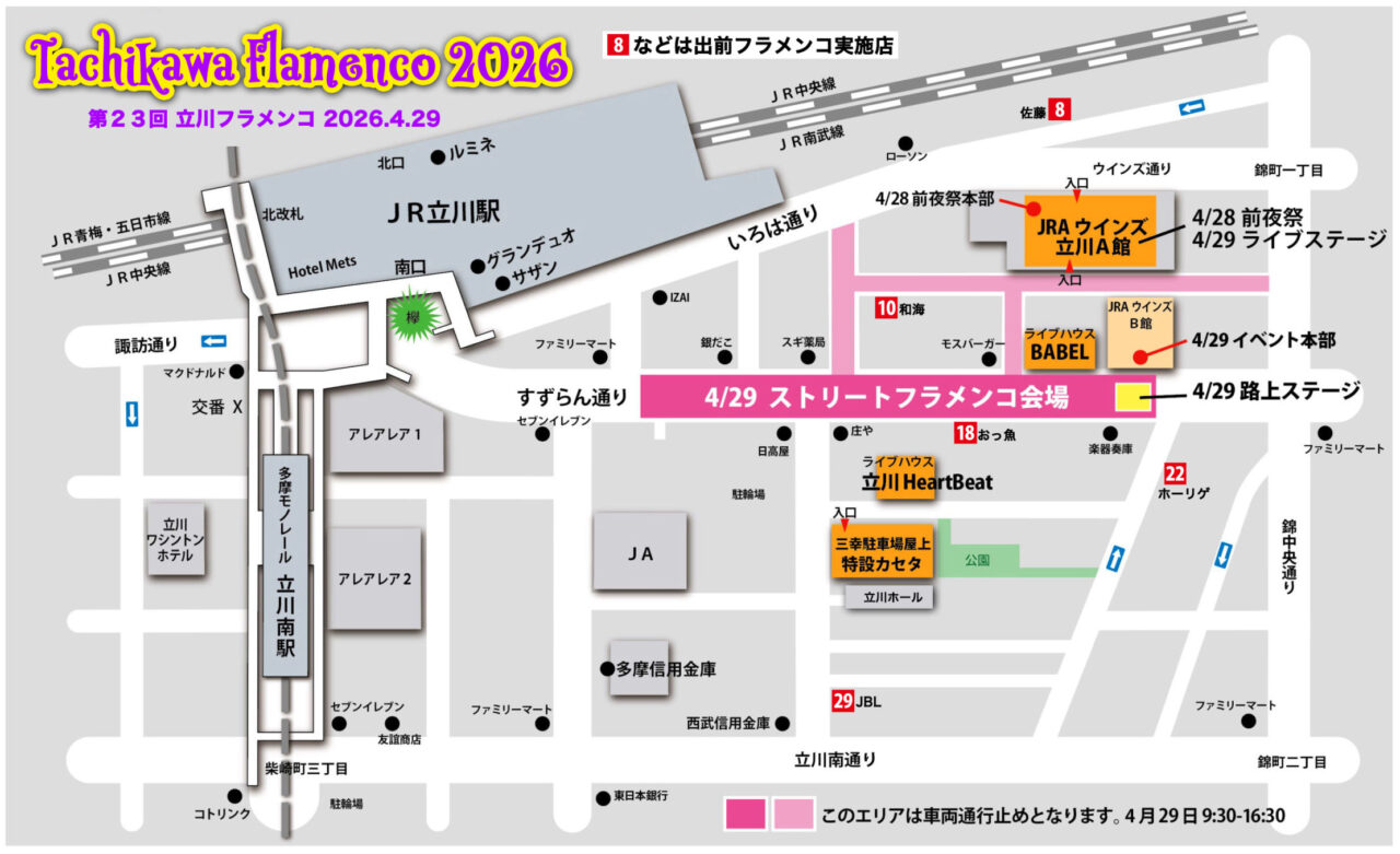 ストリートフラメンコ会場周辺は車両通行止めとなります。自転車も走行できませんのでご注意ください。当日は立川警察および警備員による警備が行われます。
