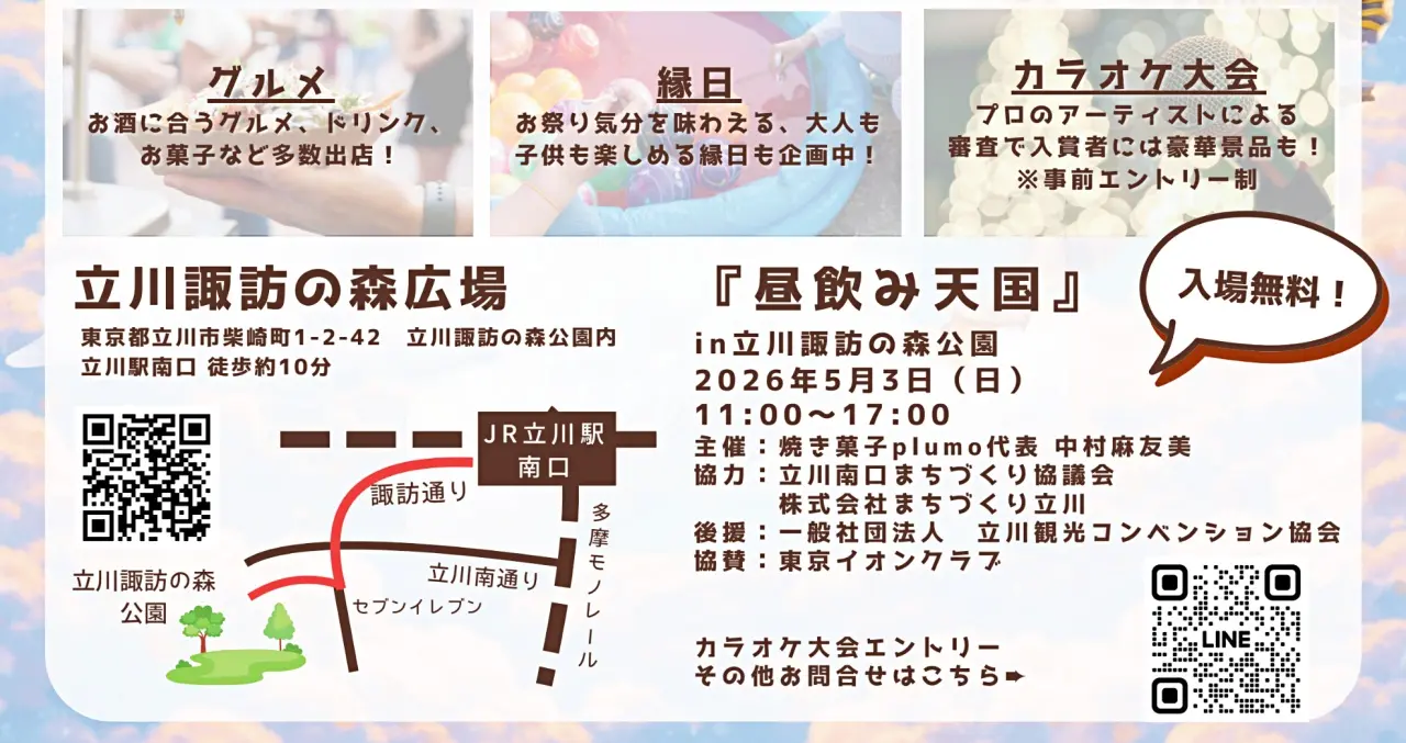 2026年5月3日(日)、立川・諏訪の森広場にて、野外で楽しむ昼フェス「昼飲み天国」が開催されます。